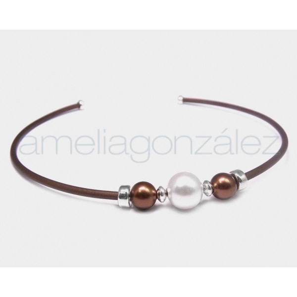 GARGANTILLA PLATA RIGIDA PERLA BLANCA Y BRONCE CAUCHO BRONCE